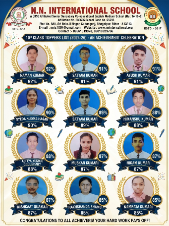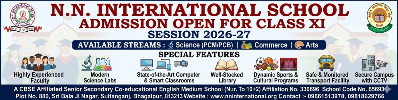 N. N. International school is an english medium co-educational senior secondary day cum residential school. it is affiliated from CBSE, New Delhi upto senior secondary lavel and managed under the management of "Janhit Siksha Sansthan" charitable trust, new delhi. The turning point of late Narendra nath dubey who is a patron of this school. He decided to educate the weaker children in order to make them "national Wealth" and laid a foundation of N.N International school at Sultanganj Town in Bhagalpur district of Bihar.